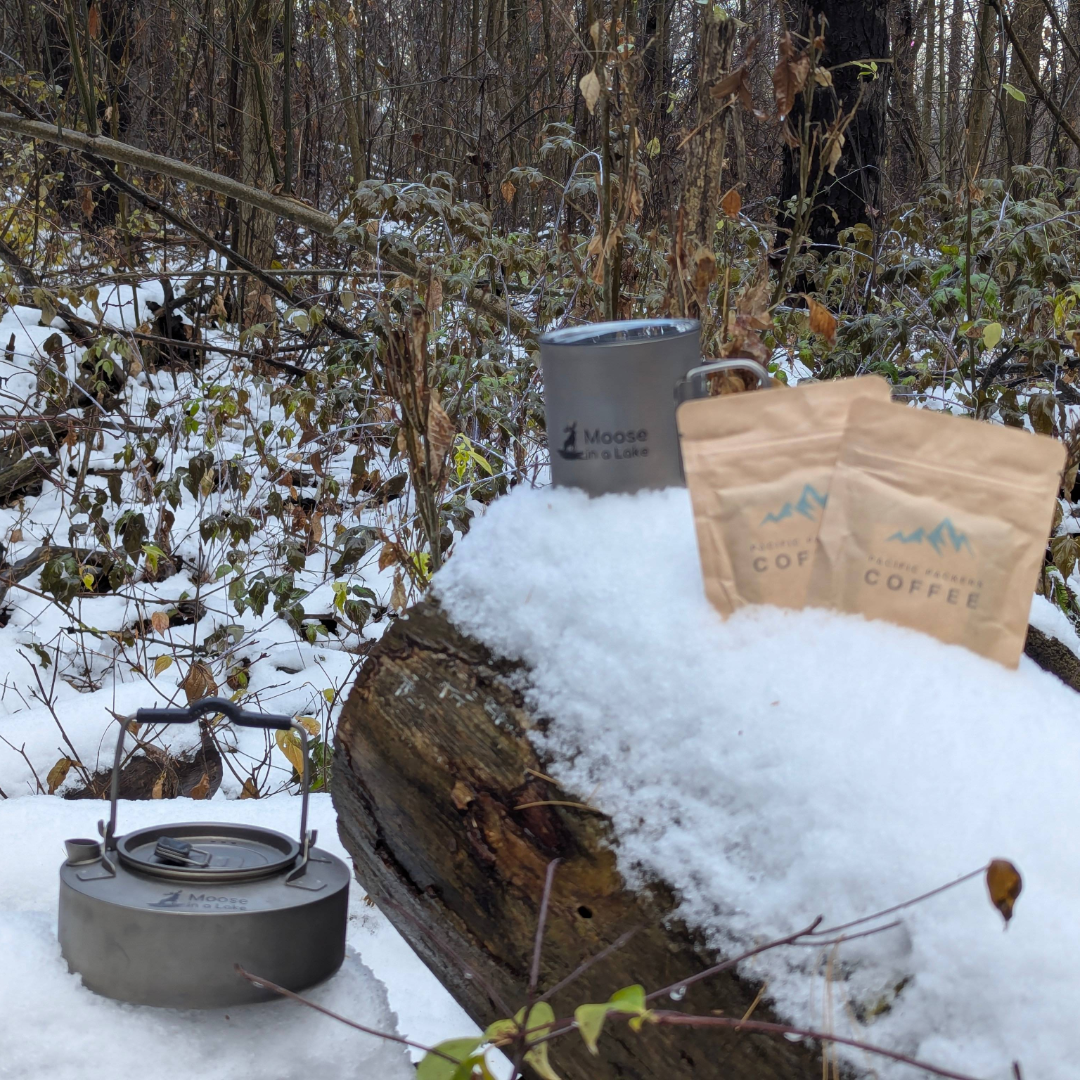 This kit includes one double wall insulated titanium camping mug, one 600ml kettle, and 4 pour over coffee packs.